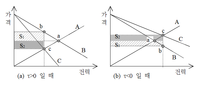 그림 3(a)는 τ가 양수일 때 수요함수의 기울기가 증가한 경우이다. 선A는 공급함수, 선B는 수요함수이고 점a는 파라미터 도입 이전의 SW 극대화 상태를 나타낸다.