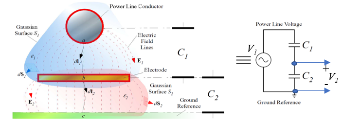 그림 1에서 전력선과 에너지 포집부 전극, 전극과 대지 간의 정전커패시턴스를 각각 $C_{1}$과 $C_{2}$이라고 할 때, 이때 전력케이블의 전압 $V_{1}$과