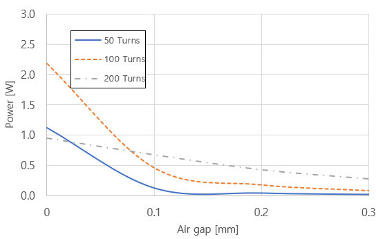 그림 4는 철심(core)간 공극길이에 따른 2차측 출력 특성을 보여준다. 공극 길이 증가시 출력은 급격히 떨어지며 중대한 영향을 미침을 알 수 있다. 그러므로
