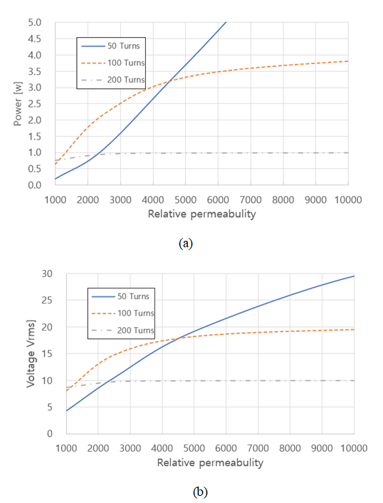 에너지 하베스팅 과정에서 출력의 크기를 좌우하는 주요 설계변수와 그 영향성을 분석하기 위해 철심(core)의 공극, 투자율, 2차측 턴수를 주요 변수를