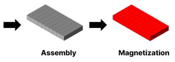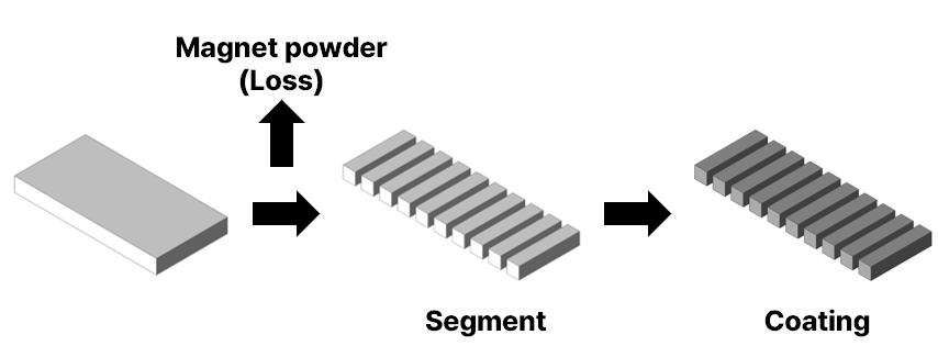 그림 2와 같이 분할, 표면 코팅, 조립 등의 공정이 요구되며 분할 시에 자석 분말이 다량으로 발생하여 재료 손실이 일어난다. 축 방향 모터의 경우에는 그림 3과 같이 자석의 분할 위치에 따라 분할된 자석의 형상과 크기가 서로 달라 조립공정의 복잡성이 증가하고 자석 단품 교체가 어려워 전체 생산 비용 증가로