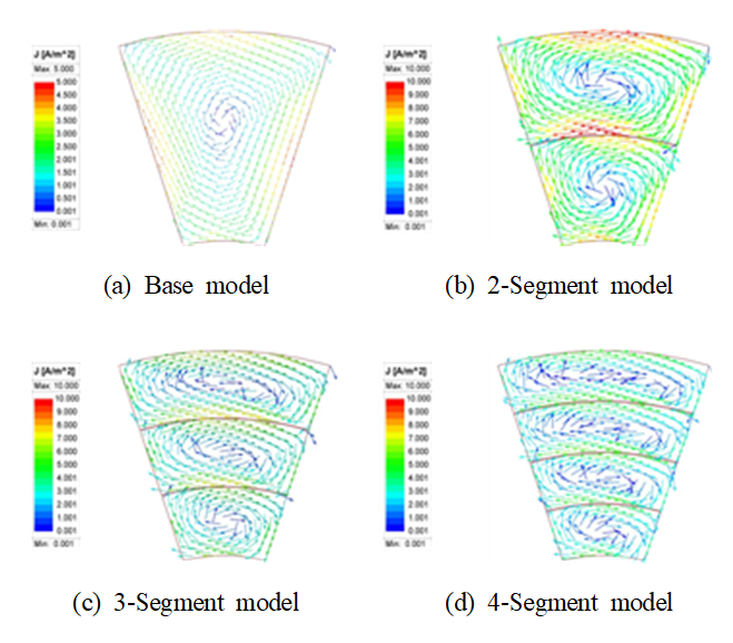 다만 홈 구조의 경우 물리적으로 와전류 경로를 완전히 차단하지 않기 때문에 분할모델 대비 많은 홈 구조가 필요하다. 이에 따라 2분할모델의 경우 5개의