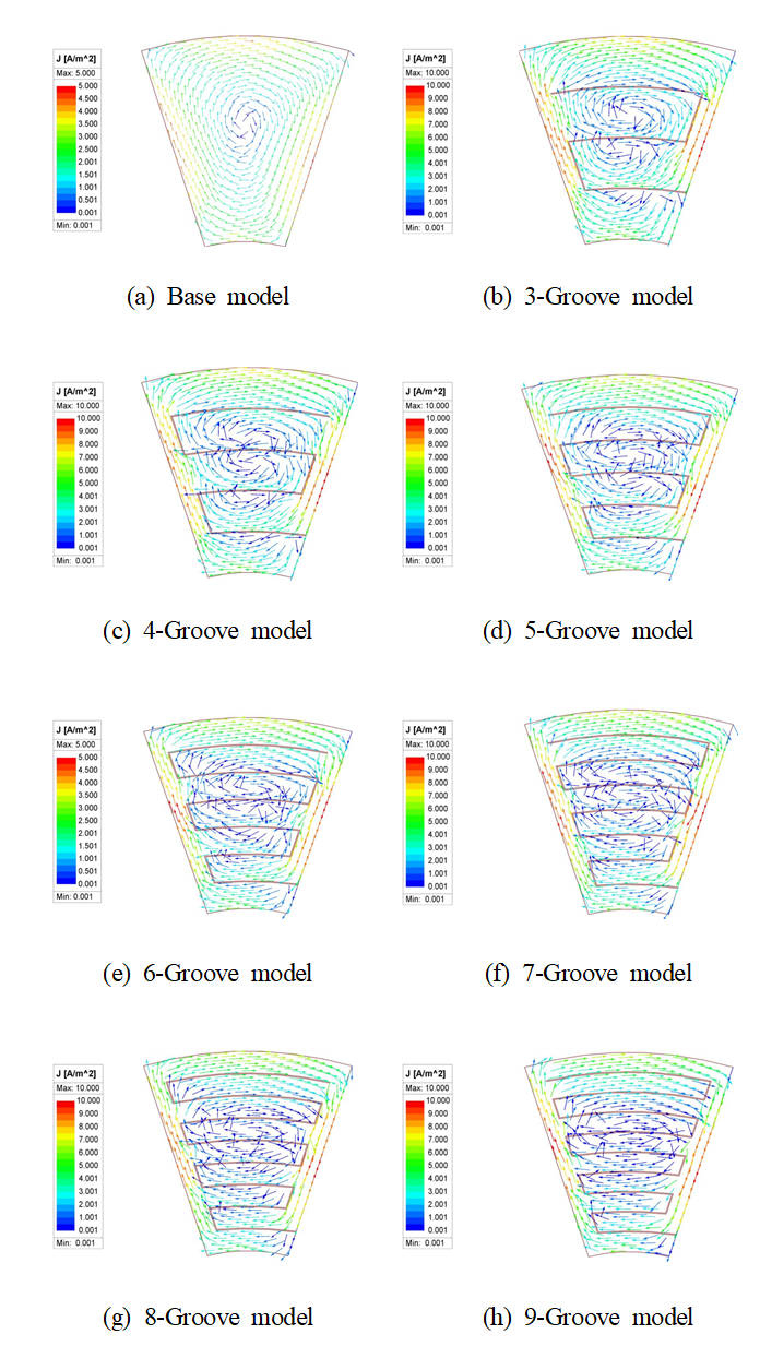 홈, 3분할모델의 경우 7개의 홈, 4분할의 경우 9개의 홈에서 유사한 성능을 확인하였다. 제안한 홈 구조는 영구자석의 일체형 구조를 유지하며 와전류