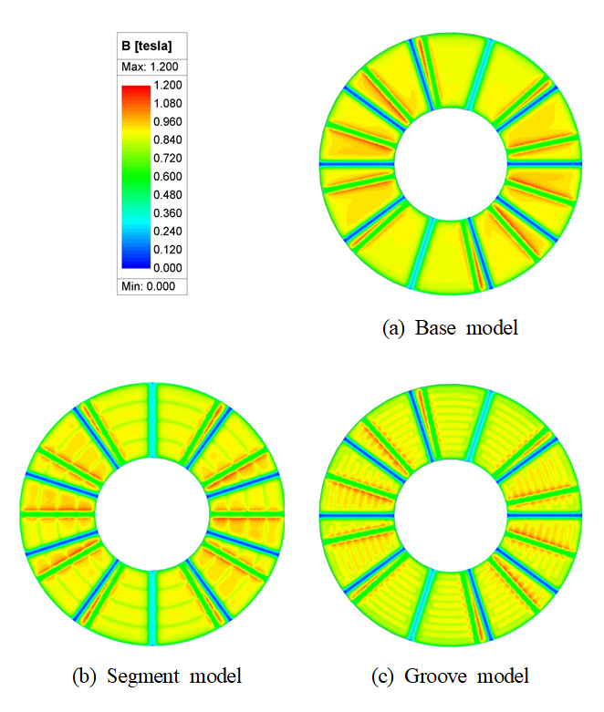 확인하였다. 그림 7은 각 구조별 모터의 공극 자속밀도이다. 기본모델 대비 분할모델과 홈 구조 모델에서 공극 자속밀도가 균일하지 못함을 확인하였고, 이러한 이유로 인해