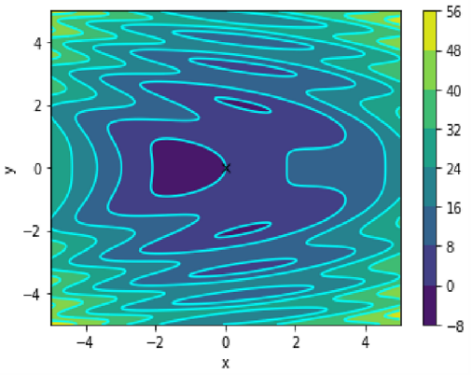 Fig. 1. Contour plot of $f(x,\: y)=x^{2}+y^{2}+5\sin(x+y^{2})$.