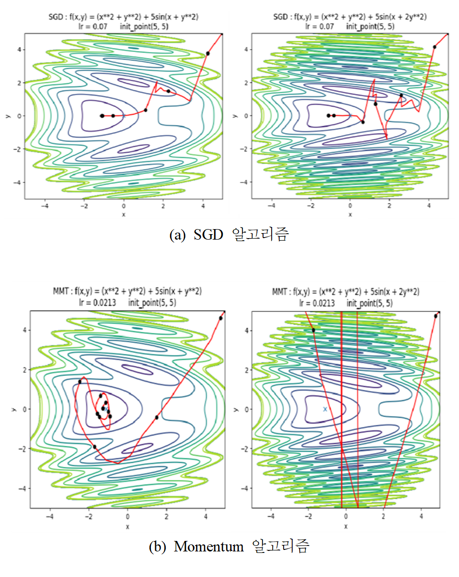 사용하였다. 따라서 그림 2의 우측 그림들은 대부분의 최적화 알고리즘의 수렴 성능이 좌측 그림에 비해서 떨어지는 것을 볼 수 있는데, (b) Momentum 알고리즘, (c)