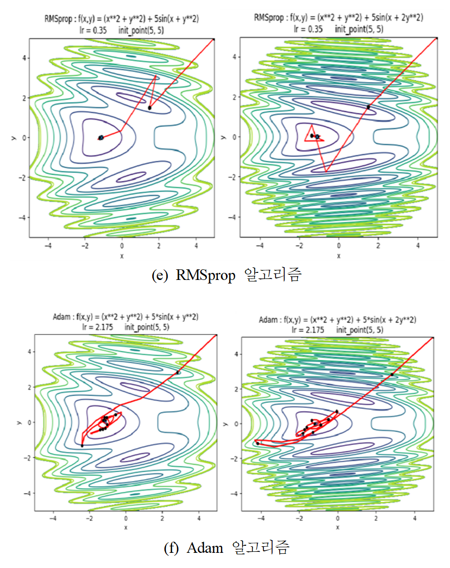 수렴하였고, RMSprop은 두 곳에서 전역 최저점으로 수렴, 두 곳에서 지역 최저점으로 수렴하였고, Adam은 세 곳에서 전역 최저점으로 수렴,