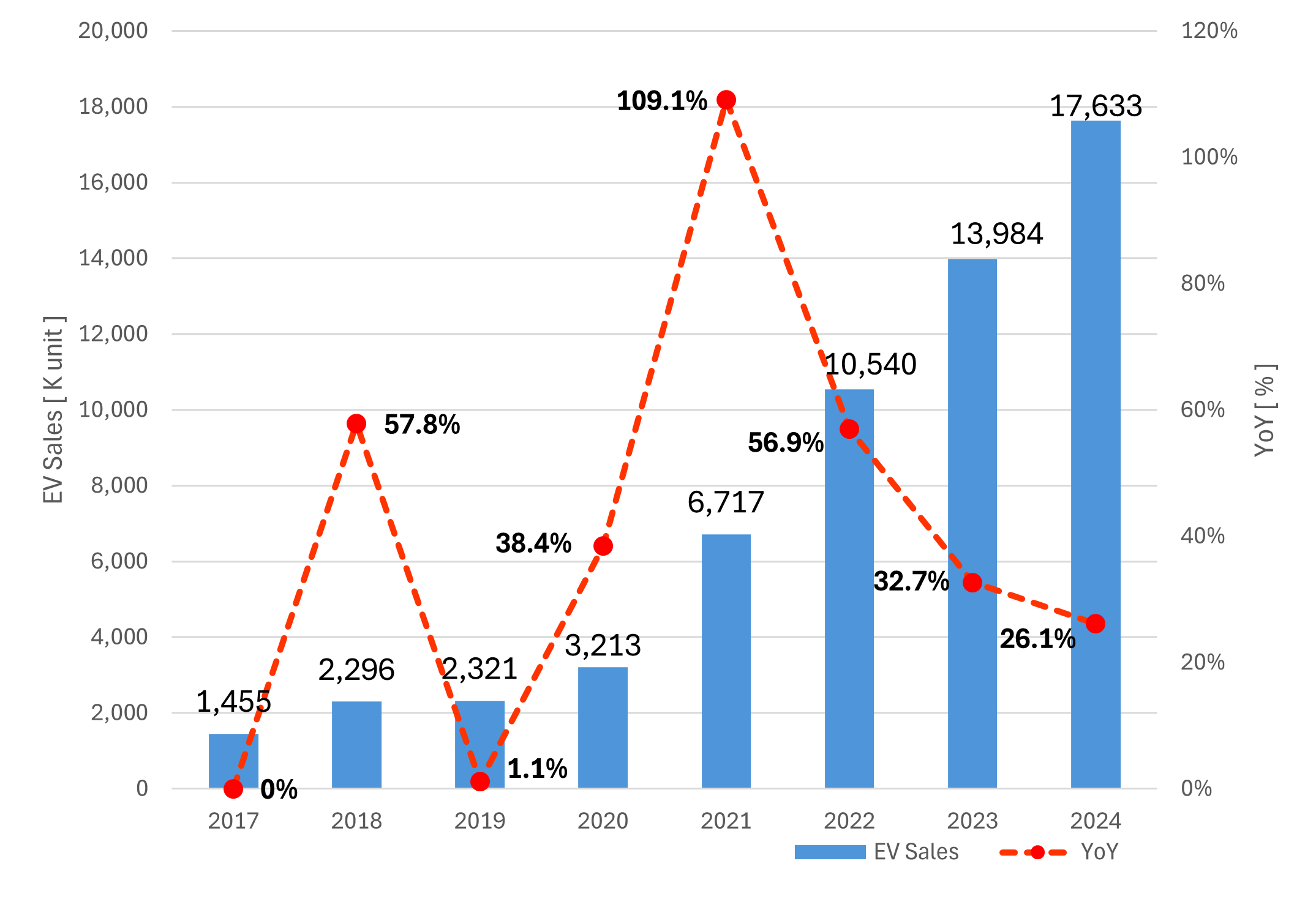 전 세계는 기후변화 위기에 대응하기 위해 탄소 중립을 목표로 친환경 자동차인 전기차 보급 확산 정책을 펼치고 있다. 그림 1은 전 세계 전기차 판매량과 전년 대비 성장률을 보여주며, 연간 전기차 판매량은 매해 증가하는 추세이다[1]. 하지만, 최근 4개년의 전년 대비 성장률을 보면 2021년 109.1%를 기점으로 감소 추세를 보이며 2024년 26.1%로 낮아졌다. 이러한