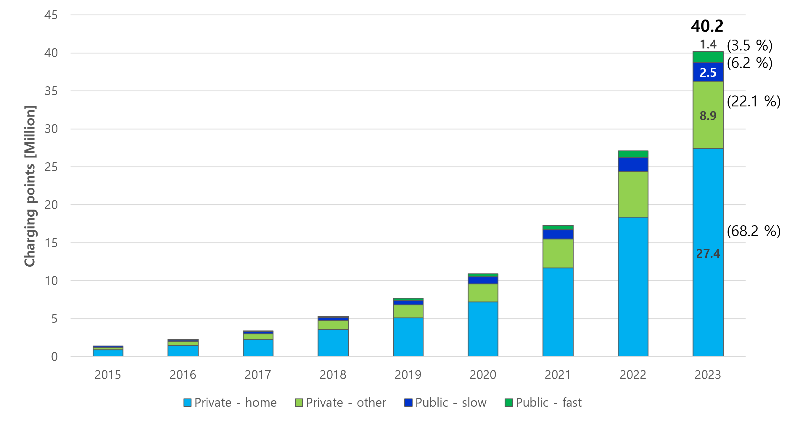 전기차 충전 인프라의 보급 현황을 보면, 그림 3과 같이 충전 소켓의 수를 의미하는 충전 지점의 누적 설치 수가 매년 증가하는 것을 볼 수 있다. 하지만, 2023년 기준 전 세계 전기차 충전 지점의