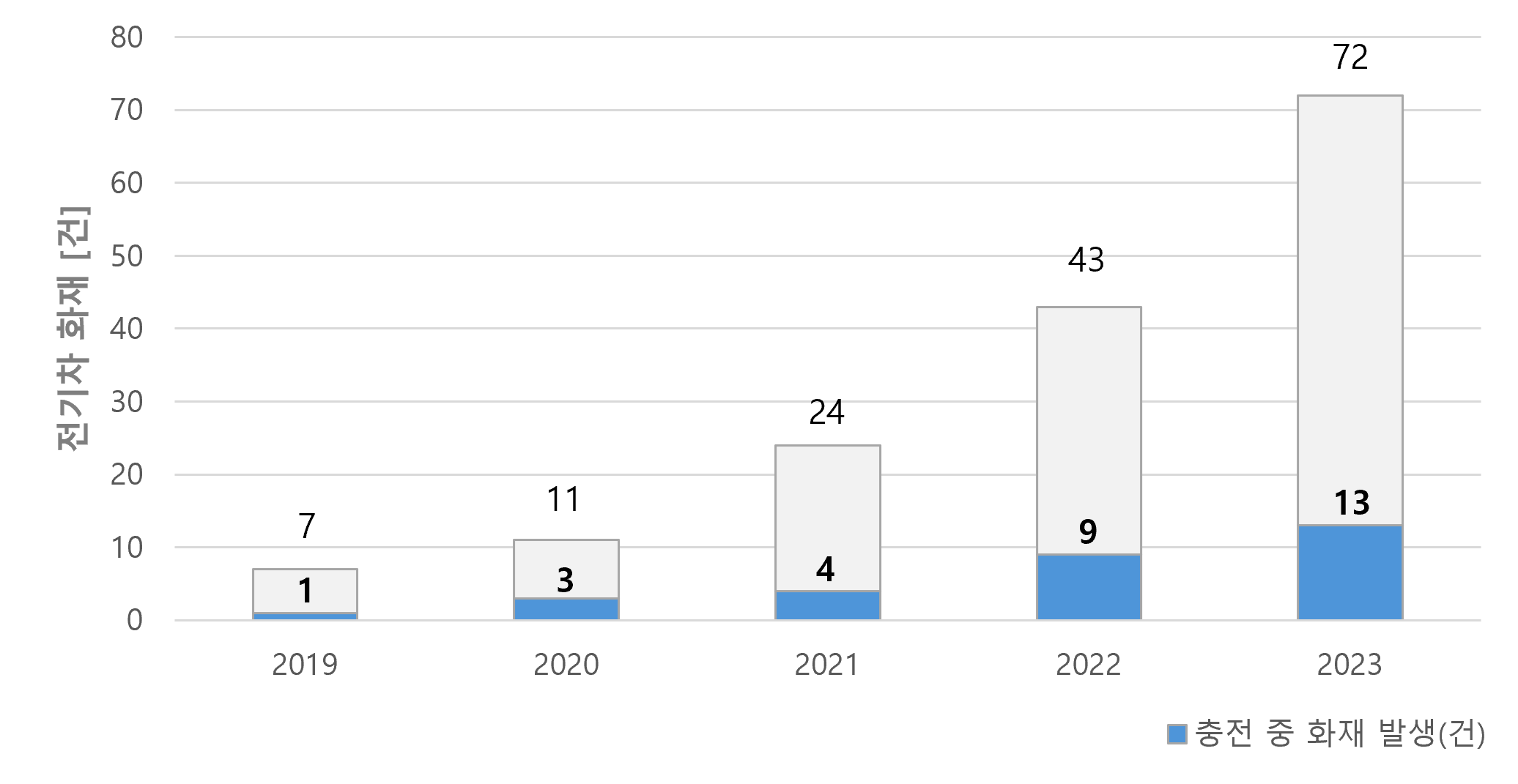 되었다. 소방청 통계에 따르면, 최근 5개년 간 국내 전기차 화재 사고는 2019년 7건에서 2023년 72건으로 증가하였으며, 그림 4와 같이 매년 상승하고 있다. 충전 중에 발생한 화재는 2023년 기준 13건으로 전체 화재 수의 18%를 차지하며, 이 또한 매년 증가하고 있다[7-8].