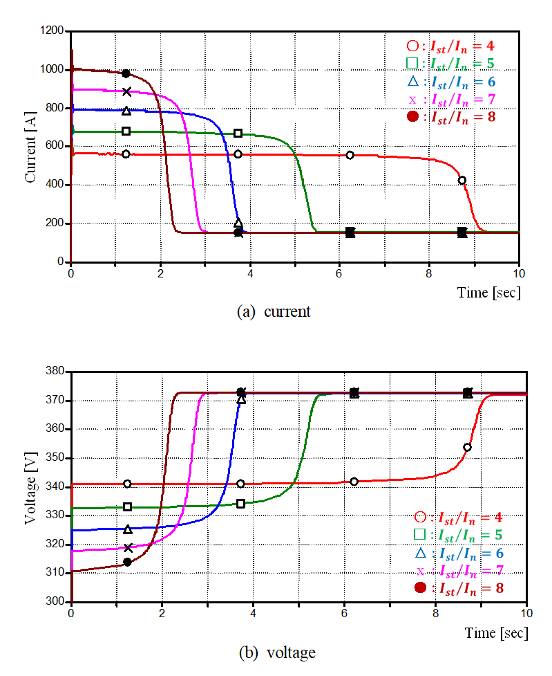 그림 5. 구속 회전자 전류 배율에 따른 기동 시 전류와 전압
