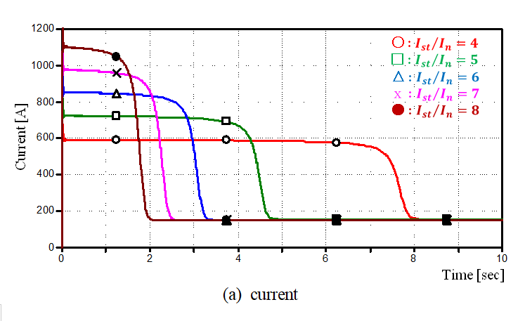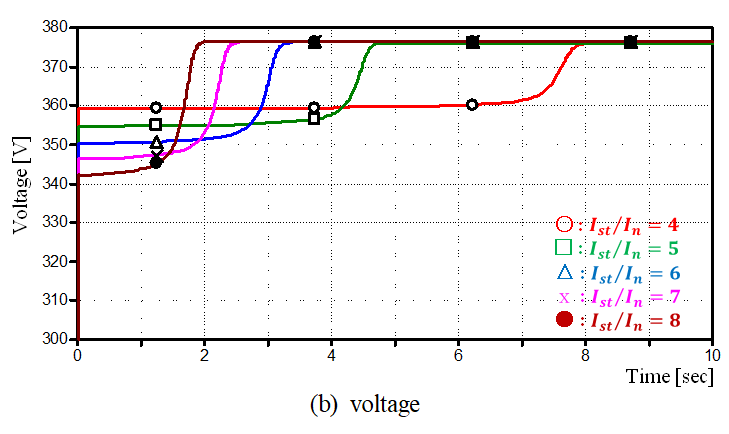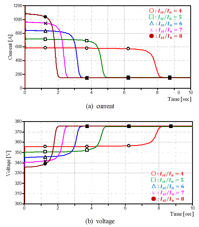 그림 5는 변압기 용량을 600kVA로 설정한 다음 표 1에 제시한 유도전동기의 기동전류 배율($I_{st}/I_{n}$= 5~8배) 변화에 따라 정격속도에 도달하기까지 전류 및 전압의 변화를 모의한 결과를 나타낸 것이다.