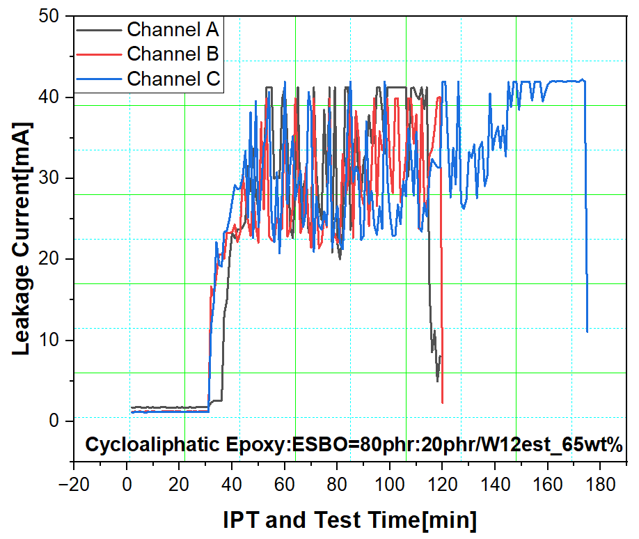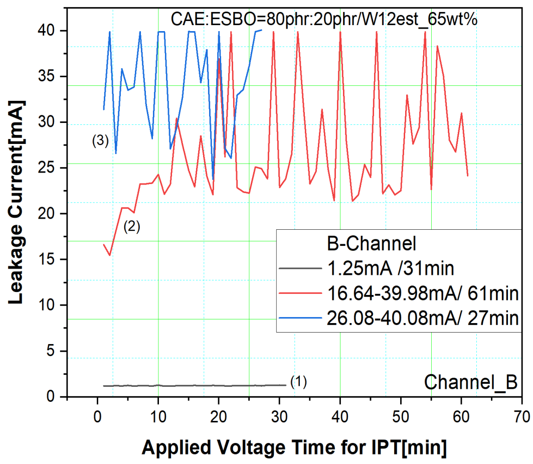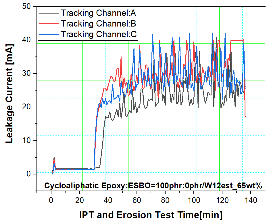 결론적으로 ESBO 함량이 증가할수록 가교점 들이 멀리 떨어져 있고 지방족의 체인이 많아져 표면방전이 강화되어 누설전류 증가도 빨라지고 그로 인한