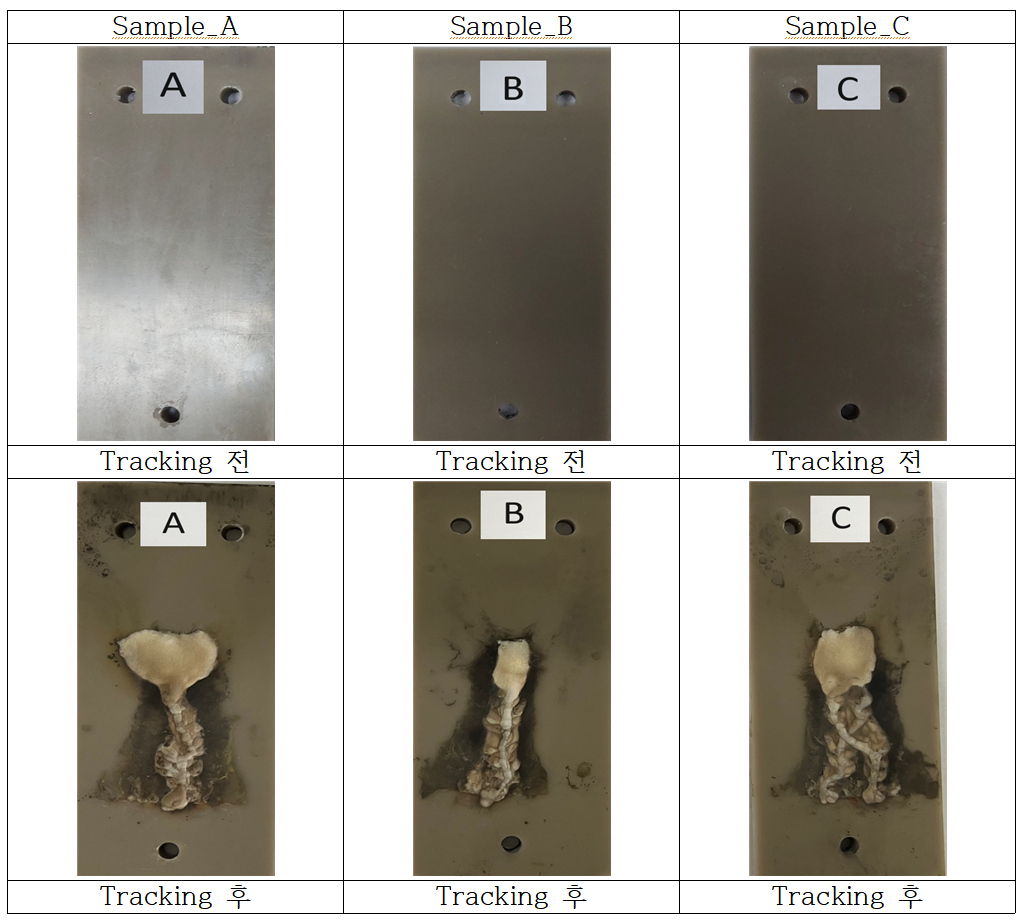 평가내용은 시간에따른 누설전류크기와 트래킹 길이 내에서 열화상 카메라를 이용한 실시간 표면온도 데이터를 얻었고 그리고 침식량을 계측하였으며, 트래킹