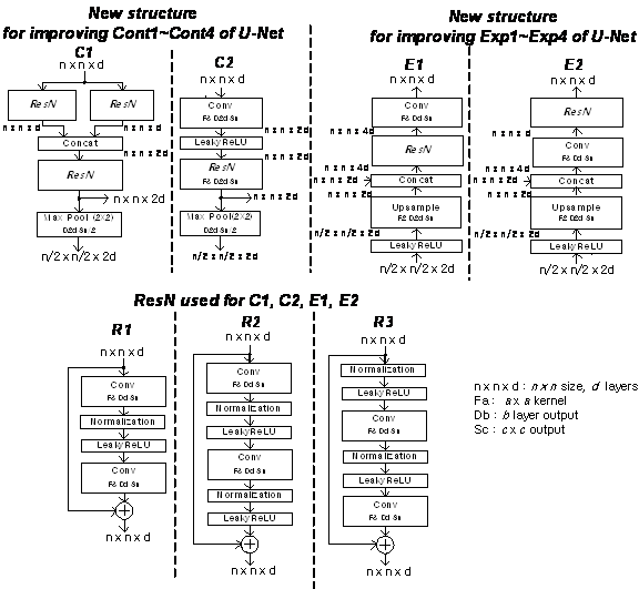 영상을 복원할 때 영상 복원 성능을 극대화하기 위하여 먼저 3장에서 설명한 U-Net의 구조를 개선한 구조를 제안한다. 그림 4에 기존의 U-Net의 구조를 개선하기 위해서 contractive path와 expansive path의 각 stage에서 사용되는 새로운 구조를