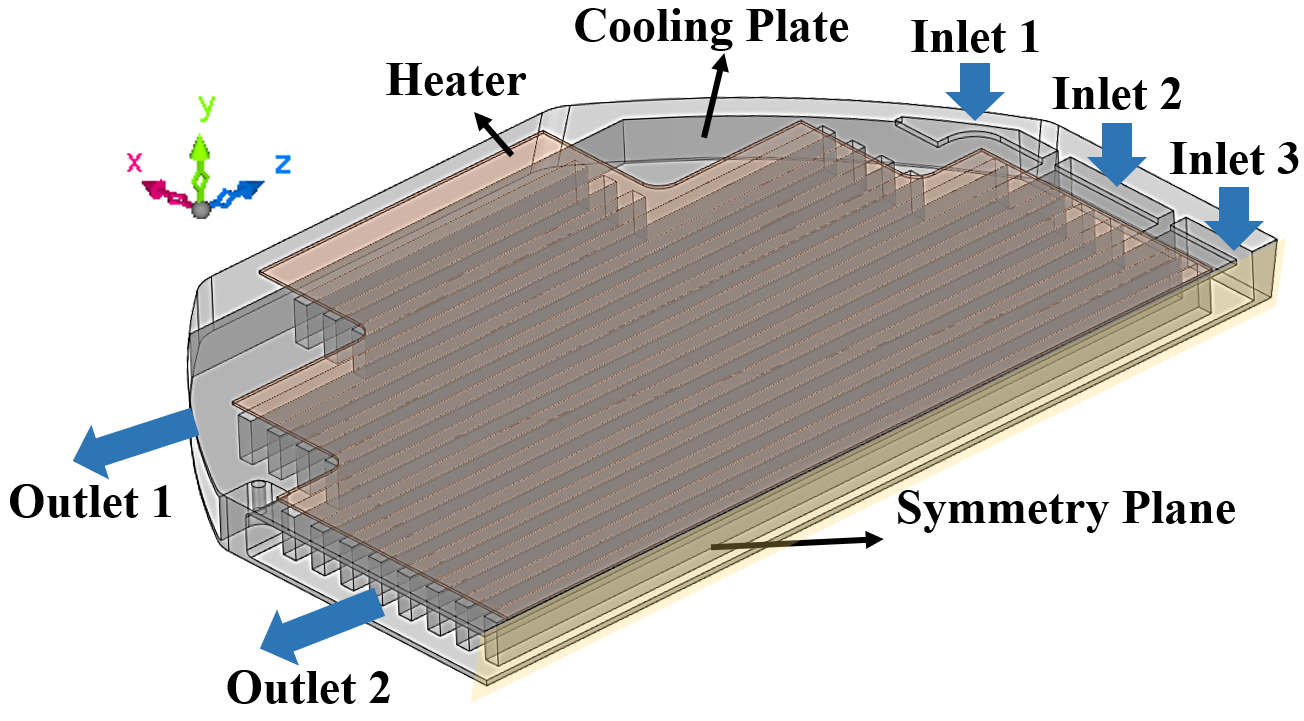 냉각판의 성능 평가를 위해 상용 열-유동 해석 프로그램인 Cradle (Hexagon, Sweden, V2024.1)를 사용하였다. Fig. 1은 레이더 냉각 모듈을 나타낸다. 냉각 모듈은 냉각판, 발열체, 냉각 유체로 구성된다. 발열체는 냉각판의 윗면에 위치하며 균일한 열량이 발열된다. 냉각 유체는 공기를 사용하였으며, 유입구(inlet)를 통해 내부 유로로 유입된 후 유출구(outlet)를 통해 외부로 배출된다. 해석모델은 안테나 냉각판 중앙 대칭면(symmetry plane)을 기준으로 1/2 대칭 모델을 사용하였다. 냉각판과 발열원의 소재는 알루미늄이며 사용된 재료의 물성치는 Table 1에 정리하였다.