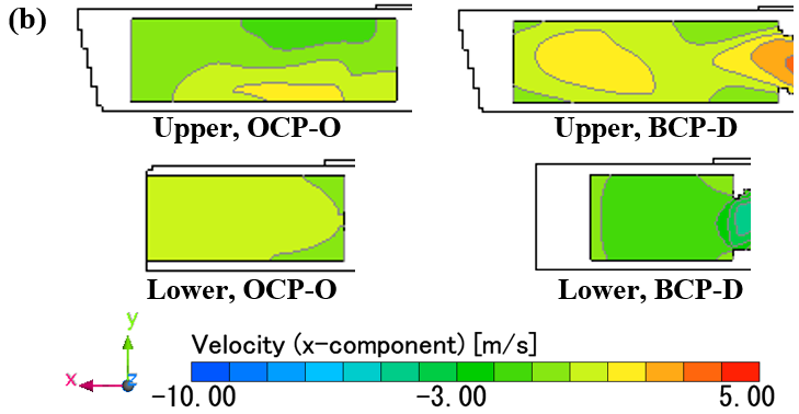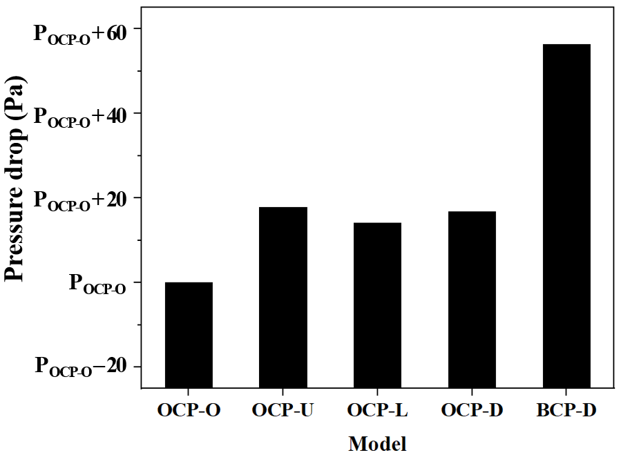 DfAM 기반 설계에서 적용된 대각 유로 구조는 유량의 분기점 증가와 전체 유동 경로의 연장으로 인해 유동 마찰 손실이 유발되며, 이는 압력 강하 증가로 이어질 수 있다[17]. 특히, 항공우주 및 방위산업 분야와 같이 고출력 장비의 집적화로 인해 높은 열부하가 발생하고, 동시에 제한된 에너지 자원과 시스템 효율이 중시되는 응용 환경에서는 단순한 냉각 성능 향상을 넘어서, 유동 저항에 따른 압력 손실까지 종합적으로 고려한 열관리 시스템 설계가 필수적이다. 냉각 성능과 유동 저항 간의 균형을 정량적으로 평가하기 위해 압력 강하와 온도 간의 상관관계 분석이 필요하다. Fig. 12는 OCP 및 BCP 모델의 압력 강하 비교 결과를 나타낸다 유동분배 개선 유로구조는 냉각성능을 개선하는 동시에 압력손실을 증가시키는 경향을 보였으며, 특히 BCP-D 모델은 상·하부 대각 유로와 측면 유출구 차단 구조의 적용으로 인해 유동선의 길이가 증가되면서 OCP-O 대비 압력 강하가 56.3 Pa 증가하였다. 이는 향상된 냉각 성능과 더불어 유속 증가에 따른 유동 저항도 함께 증가했음을 의미하며, 열전달 효과 외에도 압력손실과 같은 에너지 효율을 고려한 부품 성능 평가가 필요하다.