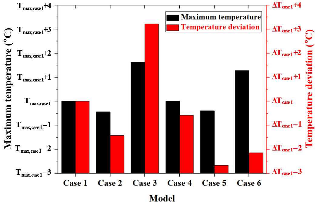 Fig 4는 유량 비율에 따른 냉각판 온도 분포를 나타낸다. Fig. 5는 유량 비율에 따른 최고 온도 및 온도 편차를 나타내며, Table 3은 Case 1을 기준으로 각 Case에서의 상대적인 최고 온도와 온도 편차를 정리한 결과이다. 유입구 1의 유량이 감소함에 따라 냉각판 최대온도 발생영역은 냉각판 중심부에서 외각으로 이동하였다. 유입구 1에 전체 유량의 50%로 낮아질수록 최고 온도가 0.48% 감소하고, 온도 편차도 6.89% 감소하였다. 하지만 Fig. 4(c)와 같이 유입구 1에 전체 유량의 40%로 감소할 경우, 최고 온도가 2.29%, 온도 편차가 15.58% 증가하였다. 이를 통해 유입구 1의 유량이 50% 미만으로 감소함에 따라 냉각판 중심부에서 외곽으로 고온 영역이 확산되며, 전체 냉각 효율이 저하되었다. 유입구 2,3의 세부적인 유량 분배에 따른 영향도를 평가한 결과, Fig. 4(d)와 같이 Case 4(30:20)일 때 Case 5(20:30) 대비 최고온도가 0.58%, 온도 편차가 11.52% 높았다. 한편, Fig. 4(f)와 같이 Case 6(10:40)일 때 Case 5 대비 최고온도가 2.35%, 온도 편차가 2.93% 높았다. 유입구 2,3의 유량비를 20:30으로 설정한 Case 5가 전체 모델 내에서 가장 우수한 냉각 성능을 보였으며, 특히 최고 온도와 온도 편차 측면에서 최적의 유량 분배 조건임을 확인하였다.