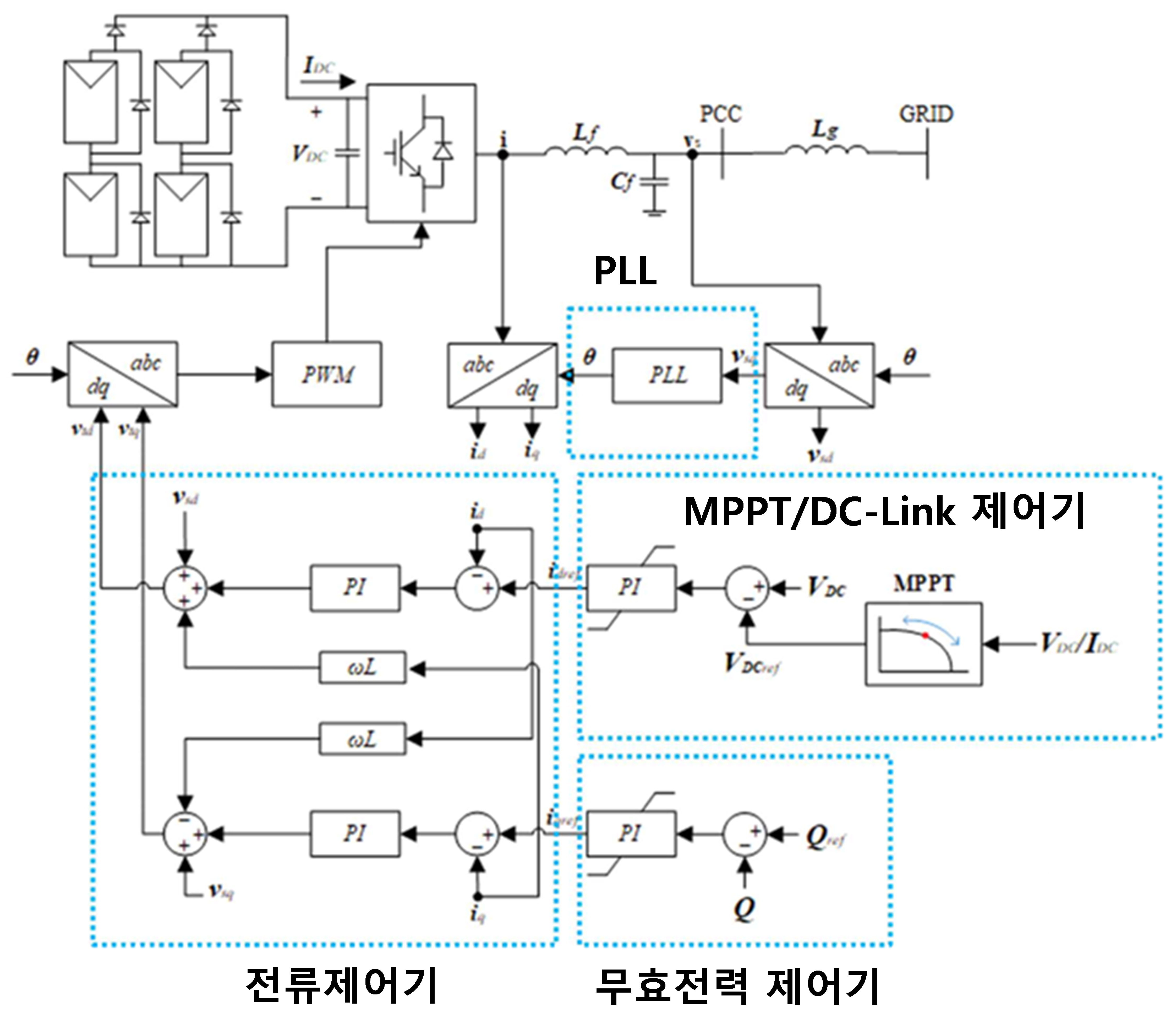 PV IBRs는 PLL을 통해 계통과 동기화 되는데 dq축 전류 제어를 통해 유무효 전력과 입출력을 제어한다. 그림 4는 일반적인 Single Stage PV IBR의 구조로 d축 전류 지령치는 MPPT/DC-Link 제어기를 통해, q축 전류 지령치는 무효전력 제어기로부터