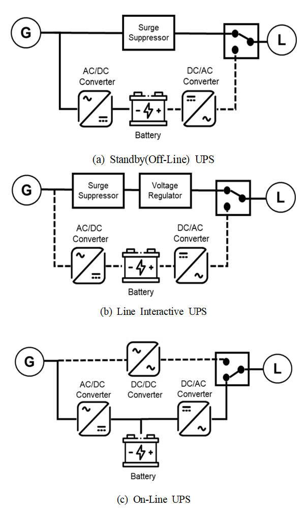 On-line UPS는 입력 전원을 상시 변환하여 부하에 공급하는 이중변환(Double Conversion) 방식의 무정전 전원공급장치이다. 그림 1-(C)와 같이 교류(AC) 전원이 UPS에 입력되면 정류기, 인버터를 거쳐 부하로 공급된다. 해당 과정에서 UPS는 배터리를 항상 충전 상태로 유지하며,
