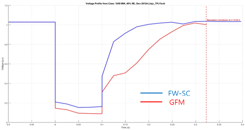 전력계통내에 단락 또는 지락고장에 의한 전압변동에 대해서 FW-SC와 GFM은 관성기여 및 유효전력 공급 이외에도 무효전력을 공급하여 전압보상이 가능하기