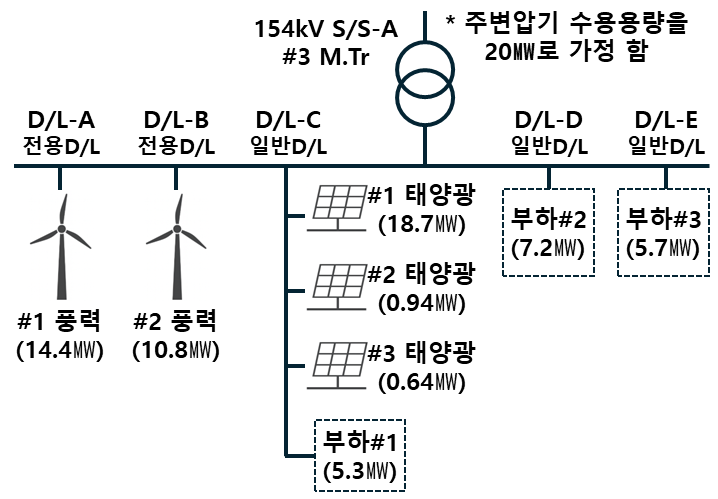 연계되어 있고, 일반선로(D/L-C)에는 18.7㎿, 0.94㎿, 0.64㎿ 규모의 태양광 발전설비 (총 20.3㎿)와 5.3㎿의 일반 부하가 함께