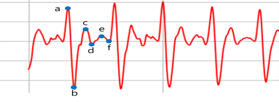 PPG의 R-Peak와 거의 동시에 발생해 기준점으로 활용하기에 안정적이다. 이어지는 c, d, e, f 점은 대동맥 탄성 및 말초 저항으로 발생하는