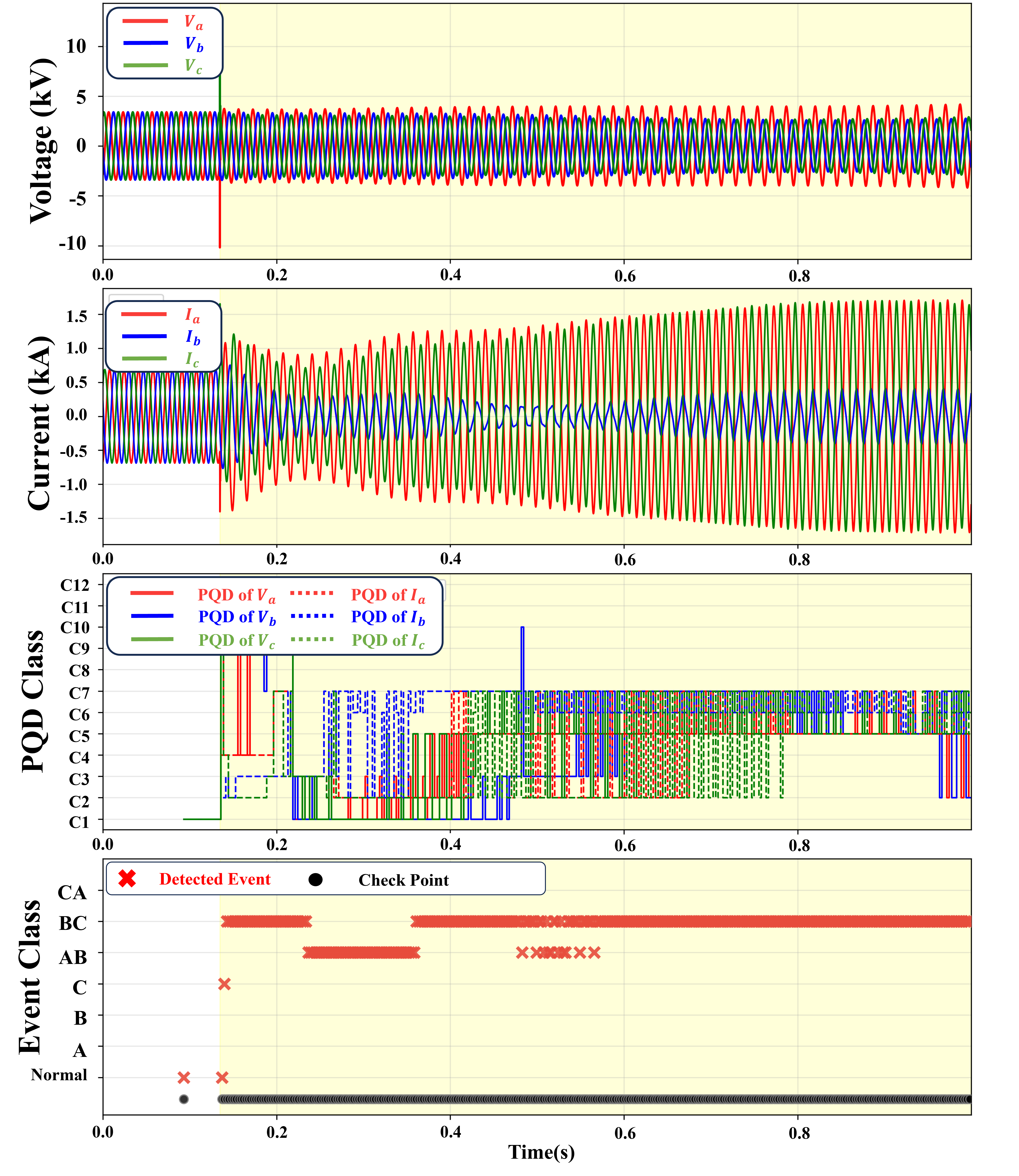 전류, 또는 주파수의 변동으로 정의되는 이러한 현상은 비정상 운전 상태의 지표로 활용될 수 있다. 그림 1의 순서도에 제시된 바와 같이, 본 논문에서는 계산 효율성이 높게 이벤트를 감지하기 위해 2단계의 계층적 프레임워크를 제안한다. 1단계에서는 4.16kV