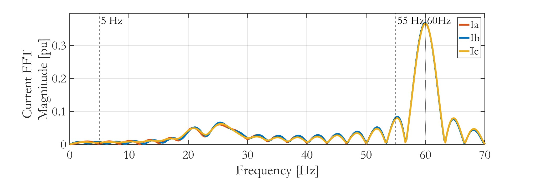 ์ ์ํ๋ค. ์ (22)์ ๊ฐ์ด ๊ณ ์ฅ ๊ตฌ๊ฐ ๋์ ์ ๋ฅ ์ ํธ์ DC ์ฑ๋ถ์ ์ ๊ฑฐํ๊ณ , ์ (23)๊ณผ ๊ฐ์ด ํธ๋ฆฌ์ ๋ณํ์ ํตํด ์ ํธ์ ์ฃผํ์ ์คํํธ๋ผ์ ๊ตฌํ๋ค. ์ (24)์ ๊ฐ์ด SSO๋ฅผ ๋์์ผ๋ก ํ ์คํํธ๋ผ($\Omega_{SSC}$)์์์ ํฌ๊ธฐ(Magnitude) ํ๊ท ์ ์ต์ข