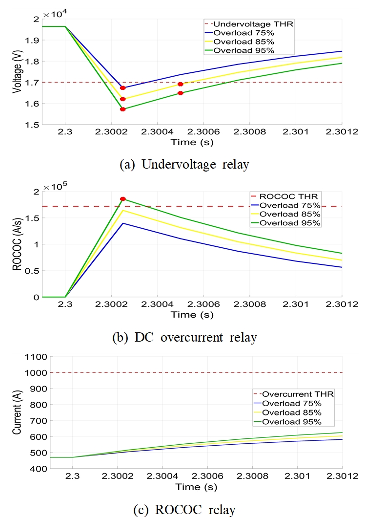 시간 지연 조건을 만족하지 않아 동작하지 않았다. 또한 DC 과전류 계전기의 경우에도 전체 부하 증가 조건에서 전류가 임계값에 도달하지 않아 고장으로