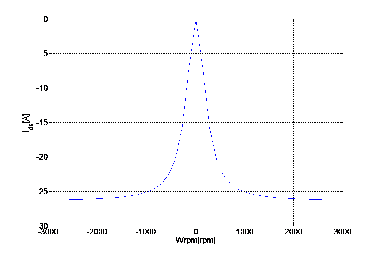 와 같다. 이 값은 속도가 0인 경우에는 0 A가 되고, 속도의 절대값이 커질수록 감소한다. 속도가 매우 높게 되면, $i_{ds}^r = - \frac{\phi_f}{L_s}$로