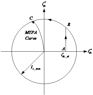 $i_{qs\_mt}^r$는 C점을 표시하고, $T_{e\_mt}$는 C점에 의하여 발생되는 토크를 의미하고 전류제한 조건을 만족하는 최대토크이며