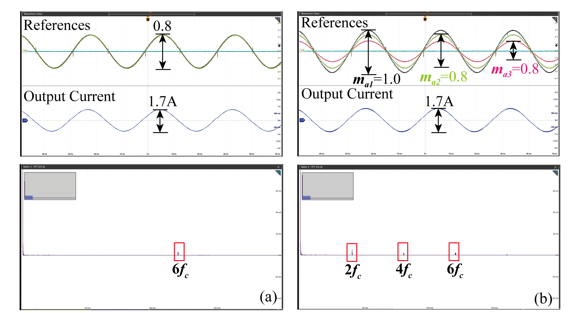 ๊ทธ๋ฆผ 24๋ SPWM ๊ธฐ๋ฒ์์ ๋ชจ๋ ๊ฐ ๊ท ํ ์กฐ๊ฑด๊ณผ ๋ถ๊ท ํ ์กฐ๊ฑด์ ์ง๋ น ์ ํธ์ ์ถ๋ ฅ ์ ๋ฅ ๋ฐ ์ฃผํ์ ์คํํธ๋ผ์ ๋ณด์ฌ์ค๋ค. ๊ทธ๋ฆผ 24 (a) 0.8๋ก ๊ท ํ์ ์ผ๋ก ๋ณ์กฐ๋ ๋ ์ฝ 1.7A๋ก ๋ํ๋๋ฉฐ ์ด๋ ์ฃผํ์ ์คํํธ๋ผ์์ ์ค์์นญ ์ฃผํ์์ 6์ฐจ ์ฑ๋ถ๋ถํฐ ๋ํ๋๋ค. ๋ฐ๋ฉด ๊ทธ๋ฆผ 24 (b)์์ ๋ชจ๋ 1์ 1.0์ผ๋ก ๋ณ์กฐ, ๋ชจ๋ 2๋ 0.8 ๋ฐ ๋ชจ๋ 3์ 0.6๋ก ๋ณ์กฐ๋ ๋ 2์ฐจ์ 4์ฐจ ์ฑ๋ถ์ด ์์ฑ๋๋ค. THD๊ฐ์ ๊ท ํ ์กฐ๊ฑด์์ 2.04%,