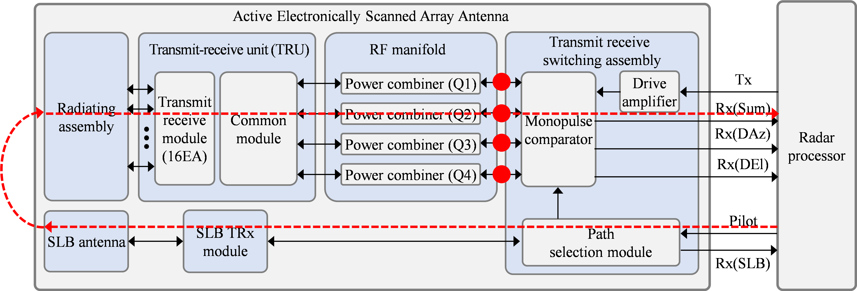 전달한다. 송수신 단위 조립체(transmit receive unit, 이하 TRU)는 다수의 TRM 및 공통모듈로 구성되며 레이다 신호를 위상 천이