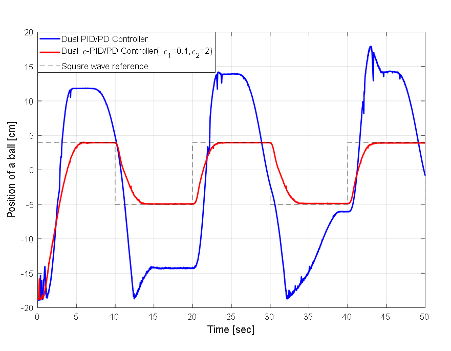 Fig. 15. Dual PID/PD controller vs dual $\epsilon$-PID/PD controller for a square-wave
