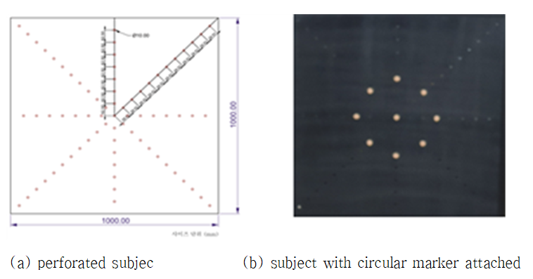 피사체에 원형 마커를 원주방향, 반경방향으로 배치할 수 있도록 피사체의 중심을 기준으로 수평, 수직, 45도 방향으로 피사체를 천공하였다(그림 3(a) 참조). 코로나카메라와 피사체가 5m 떨어진 상태에서 천공된 구멍 중에서 자외선 카메라의 최대 수직 화각 근방에 마커가 위치하도록 그림 3(b)과 같이 8각형 꼭지점과 그 중심에 원형 마커를 천공된 구멍 위에 부착하였다. 영상 정합처리를 위하여 설계 제작된 피사체의 주요 특징은 지름 27mm의