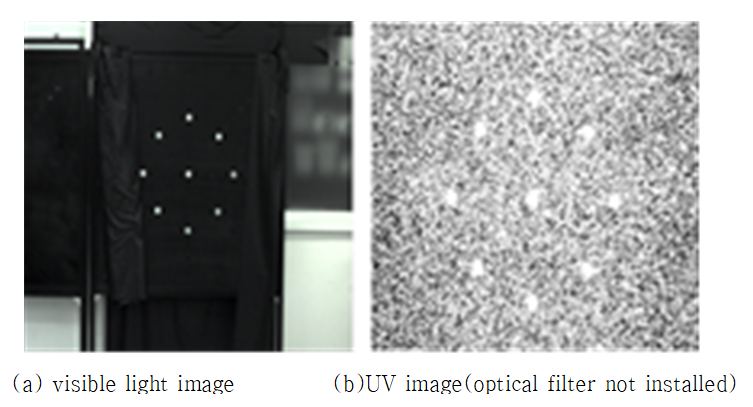 끼우지 않으면 잡음이 많이 포함되는 특성이 있다. 그림 3에 나와 있는 피사체를 찍은 가시광선 영상과 자외선 영상(광학필터 미 설치)이 그림 4에 나와 있다. 피사체에 부착된 원형마커는 가시광선 영상에서 쉽게 인식되나, 자외선 영상에서는 잡음이 많이 포함되어 원형 마커가 매우 희미하게 보인다.