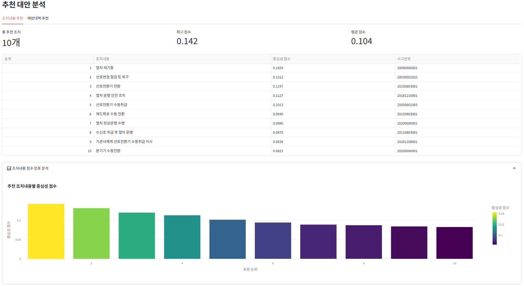 지원한다. 대안 추천 알고리즘은 유사한 사고 사례에서 도출된 조치/대책을 의미적으로 비교·평가해 상위 10개를 추천하는 것을 확인하였다. 사고유형