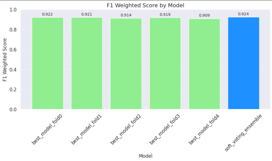 수를 가중치로 반영하기 때문에, 실제 환경에서 모델이 마주할 클래스 분포와 유사한 조건에서의 성능을 보여주기에 선정하였다. 5-Fold기반 F1-Weighted