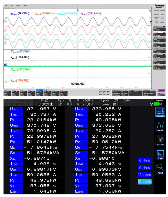 그림 10은 PSP의 정격 운전 및 정상상태에서의 시험 결과를 보여준다. 그림 10의 시험 결과는 정격전압인 1800V가 아닌 2000V에서의 시험을 진행하였다. 이는 SM의 동작 평가 시, 과전압 보호 등의 보호 동작의 검증에