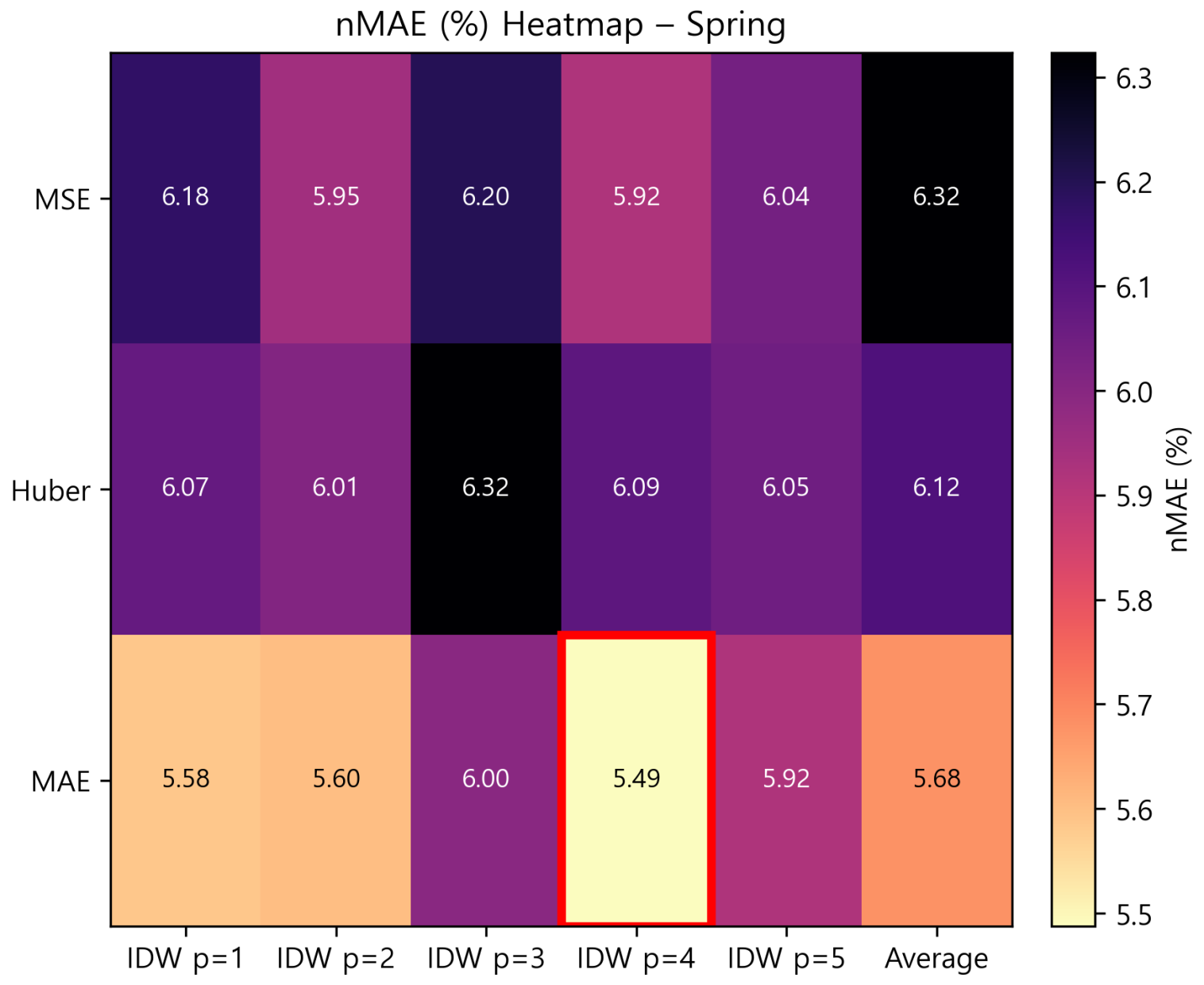 ๋ฐ Pseudo-Huber, ๊ฐ์์ IDW p=1 ๋ฐ Pseudo-Huber, ๊ฒจ์ธ์ IDW p=4 ๋ฐ MAE๊ฐ ๊ฐ๊ฐ ์ต์ nMAE๋ฅผ ๋ณด์๋ค. ์ด๋