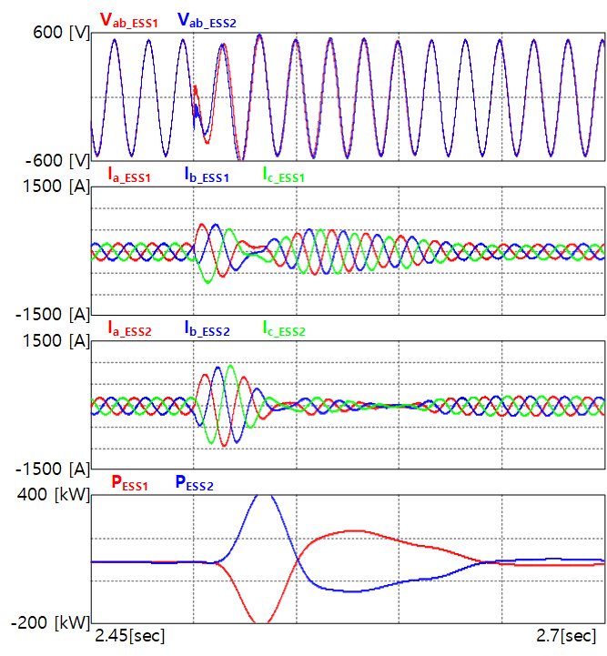 2.5초 이후에 ESS2의 ab 선간전압(Vab_ESS2)보다 위상이 느려진다. 즉, 2.5초 이후에는 ESS2 제어기에서 출력하는 전압 위상각이