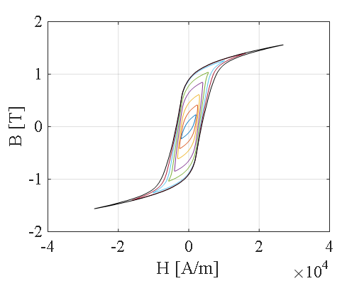 또한 사용된 해석 프로그램에서는 재료에서 얻은 히스테리시스 루프의 하강 곡선만을 사용하여 이를 표현한다. 그림 4는 해석에서 사용한 재료의 히스테리시스 루프를 보여준다. 해석에서는 그림 4와 같은 재료의 메이저 루프부터 마이너 루프 데이터를 통해 얻을 수 있는 그림 5의 하강 곡선으로 벡터 플레이 모델을 사용하여 히스테리시스 분석에 사용된다.