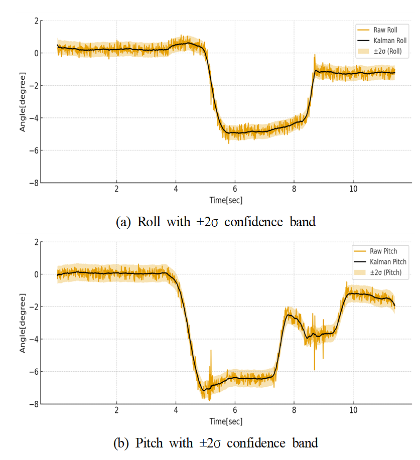λ‘€, νΌμΉ κ°λλ₯Ό μΈ‘μ νμλ€. κ·Έ κ°μ μν κΈ°μ€κ°μΌλ‘ μ€μ νκ³ , roll = $\bar{\theta}_{r}^{m}$, pitch = $\bar{\theta}_{p}^{m}$λ‘