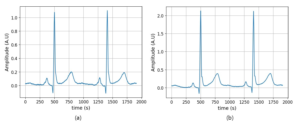 위상 차이(phase difference)로 인해 진폭(amplitude) 차이가 발생하였다. 이러한 차이는 각 피험자의 심전도 신호가 가지는 고유의