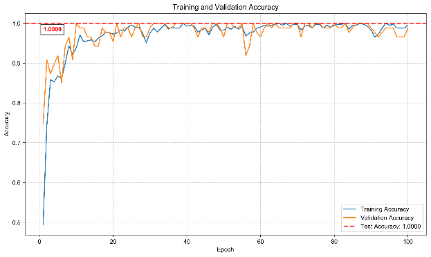 on both the validation set and the test set (test accuracy reached 1.0000), indicating