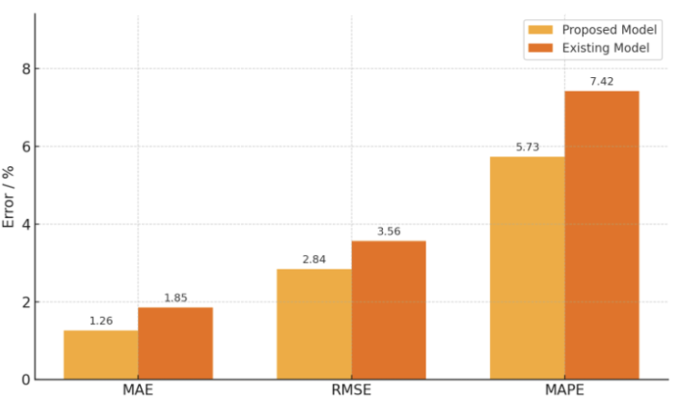 성능 비교 결과로 제안한 모델은 MAE 1.26%, RMSE 2.84%, MAPE 5.73%로 나타났으며, 기존 예측 모델에 비해 모든 지표에서 낮은