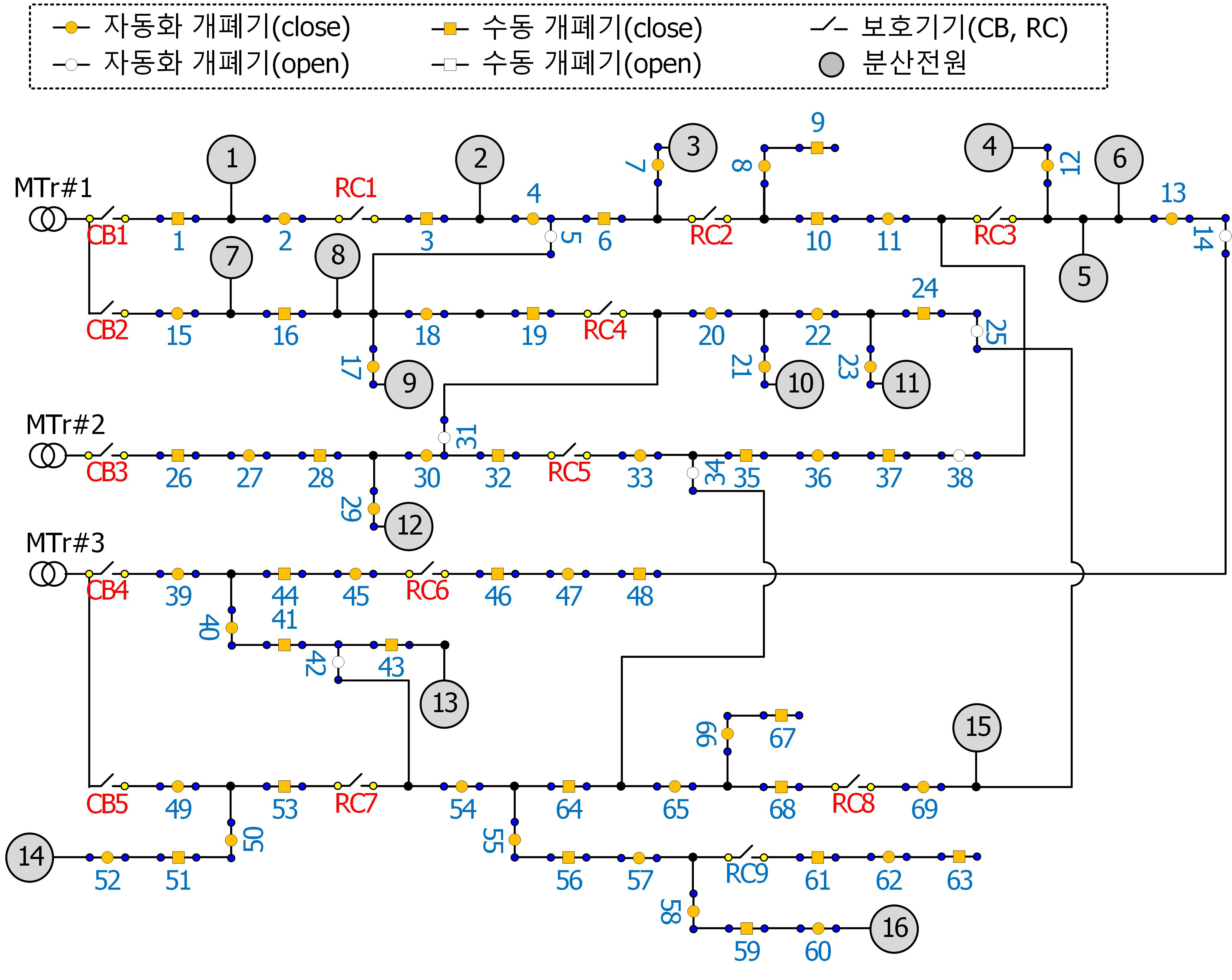 존재하는 부하를 재공급하기 위해 자동화 개폐기의 투입이 이루어진다. 이를 식 (13)-식 (29)에 대한 최적화 식에 반영하기 위해, 자동화 개폐기 기반 복구 평가 단계에서는 수동 개폐기를 식 (27)의 선로 집합으로 간주하여 복구 해를 도출한다. 이후, 자동 및 수동 개폐기를 모두 고려한 복구 평가는 앞 단계의 결과를 기반으로 고장구간 외 건전부하에
