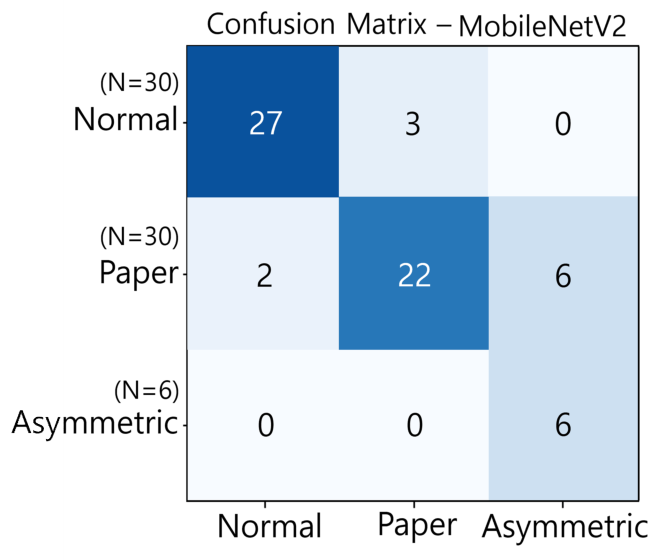 ์ด ๊ธฐ๋ณธ ๋ถํ ์ ๋ชจ๋ ๋ชจ๋ธ ํ์ต๊ณผ ํ๊ฐ ๊ณผ์ ์ ๋์ผํ๊ฒ ์ ์ฉํ์์ผ๋ฉฐ, MobileNetV2 ํ์ต ์์๋ ๋ฐ์ดํฐ ๋ถ๊ท ํ์ ์ํํ๊ธฐ ์ํด ํ์ต ์ธ์