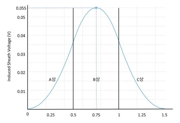 위상차가 $120^{\circ}$인 교류 전류가 각 케이블에 인가되었다. 해석 결과 자기장 성분에 의해 시스에 유도된 전압의 크기는 19.3 V로